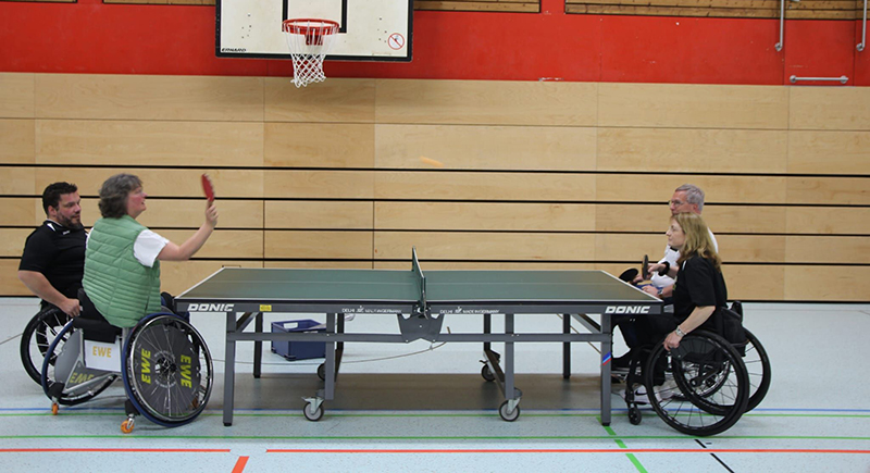 Am Nachmittag wurde dann die Öffentlichkeit zum Tag der offenen Tür empfangen. Menschen mit und ohne Behinderung konnten hier Rollstuhlbasketball und Rollstuhlrugby kennenlernen oder inklusiv Sportarten wie Tischtennis und Badminton spielen. Das Sportangebot wurde den ganzen Nachmittag gut angenommen und somit zahlreichen Besuchern gelebte Inklusion im Sport nähergebracht Zum Rahmenprogramm gehörte zudem ein Infostand des Sanitätshaus Wiggers, bei dem sich Interessierte zu Themen rund um den Rollstuhl beraten lassen konnten.