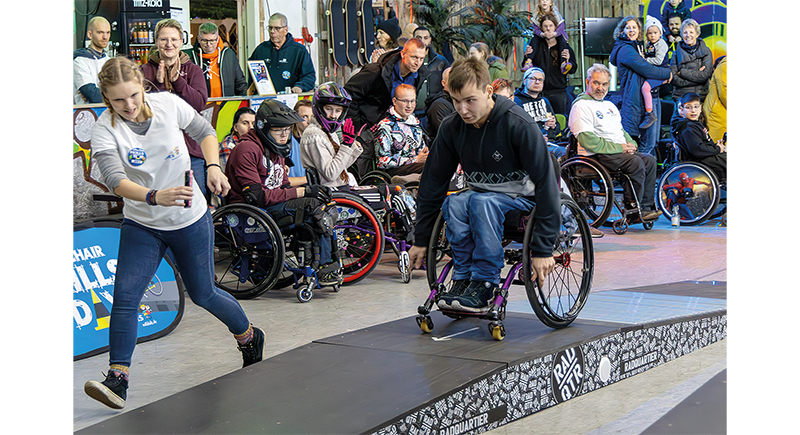 Harmonisch in die vorhandene ›Hindernislandschaft‹ des IndoorSkateparks eingebettet, forderten und förderten die Hindernisse die individuellen RollstuhlSkills der Teilnehmenden. Rund 60 Menschen jeden Alters konnten ihre sportlichen Fähigkeiten im und mit dem Rollstuhl zeigen und Neues lernen. Auch Eltern und Geschwisterkinder wagten sich in den Parcours und nutzten die zur Verfügung gestellten Rollstühle, um sich und ihre Fähigkeiten zu testen.